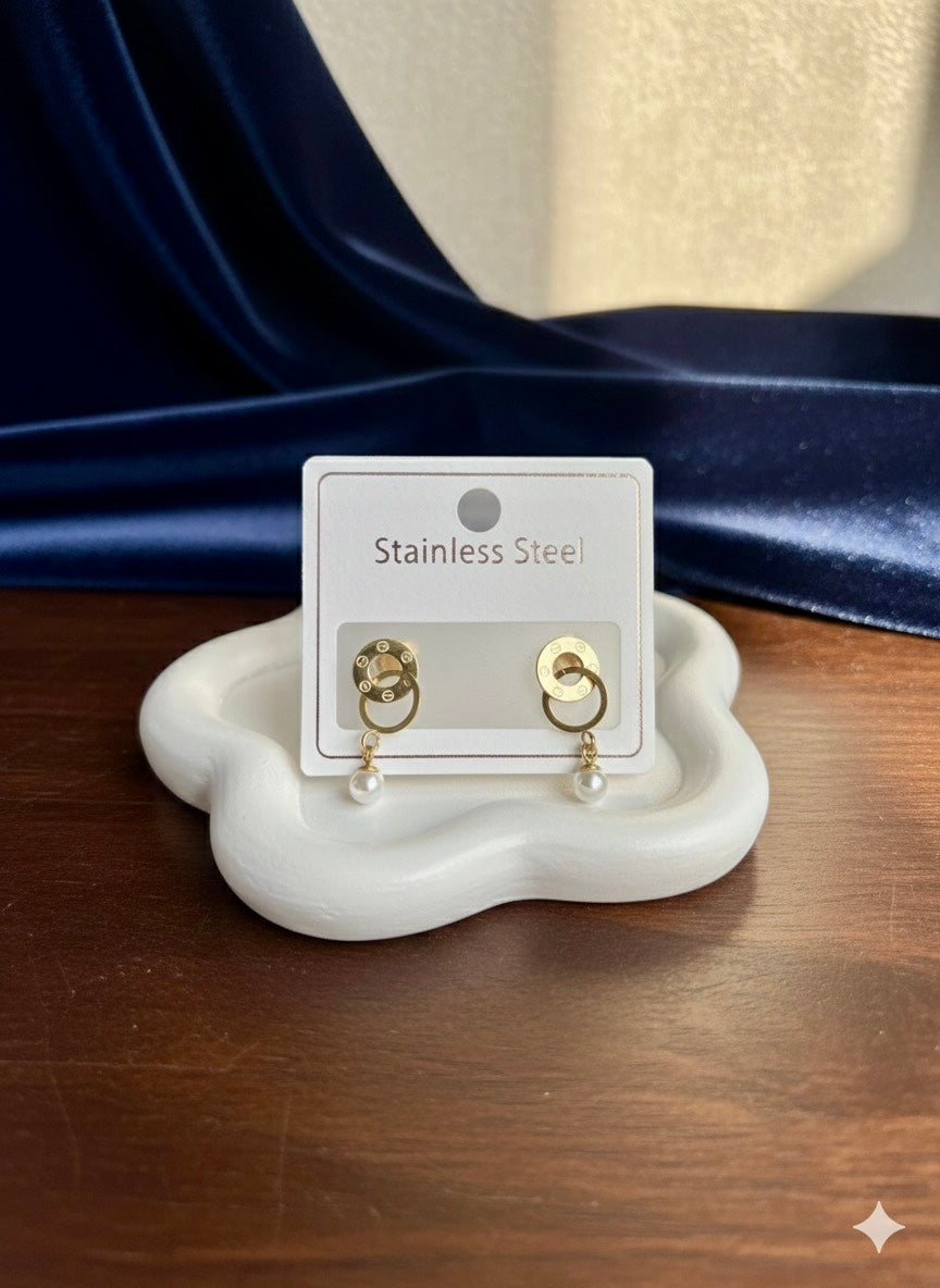 Elevate your everyday style with these exquisitely crafted stud earrings. Featuring a contemporary stainless steel design with a gleaming gold-tone finish, each piece showcases an interlocking dual-circle motif, delicately accented with subtle shimmering details. A lustrous dangling faux pearl completes the look, adding a touch of classic, timeless elegance. They are the perfect blend of modern architecture and feminine grace, making them ideal for both office wear and evening events.