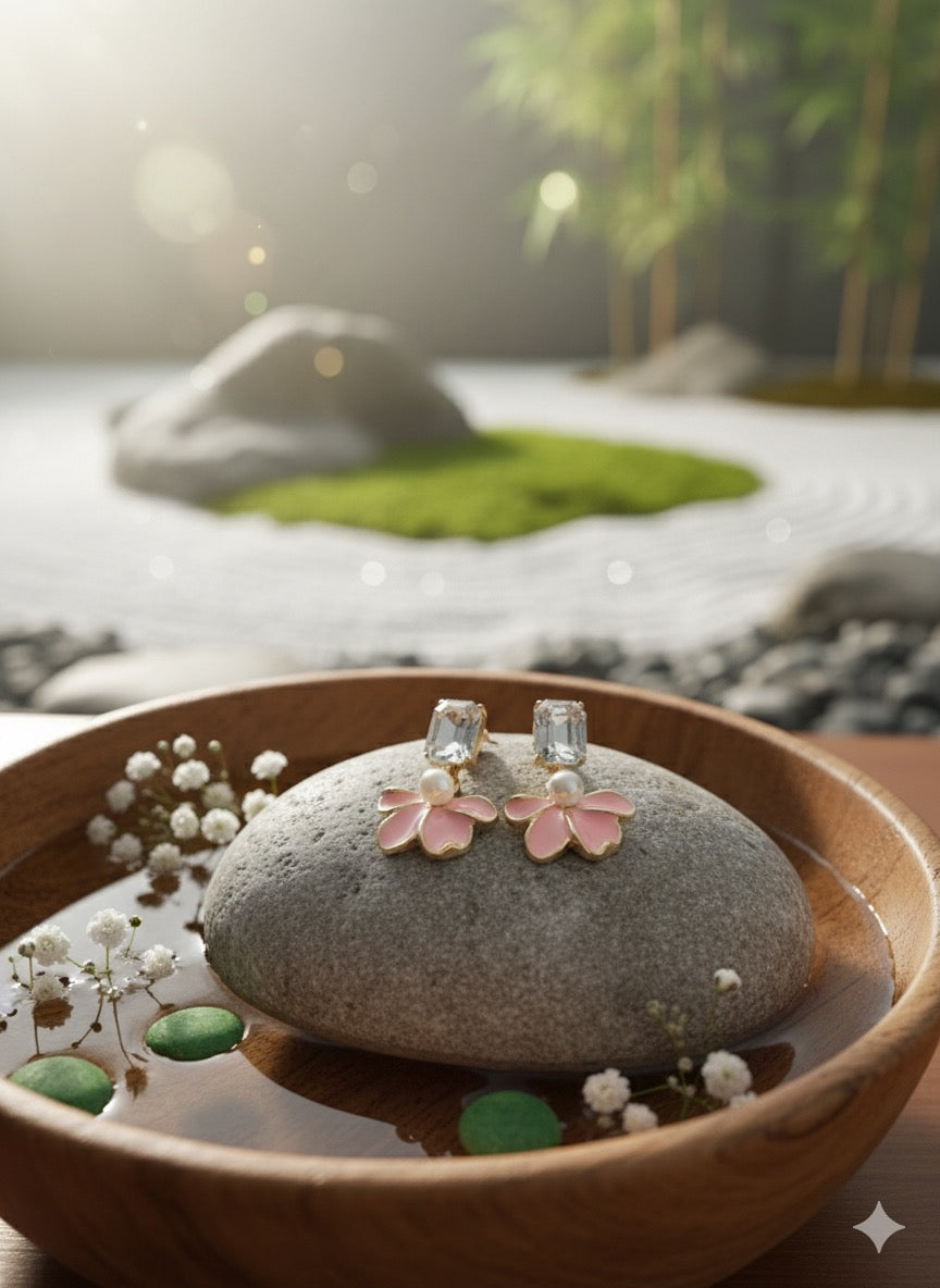 Adorn yourself with the delicate beauty of the Blossom Pearl Studs. These elegant drop earrings feature a brilliant, square-cut Cubic Zirconia (CZ) stone for maximum sparkle, leading to a gracefully enameled pink flower petal design centered with a shimmering pearl. Their gold-toned setting adds a touch of classic sophistication, making them perfect for adding a feminine flourish to your everyday wear or a charming detail to a formal look.