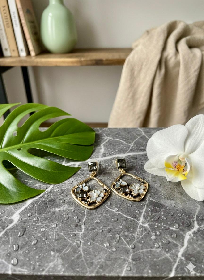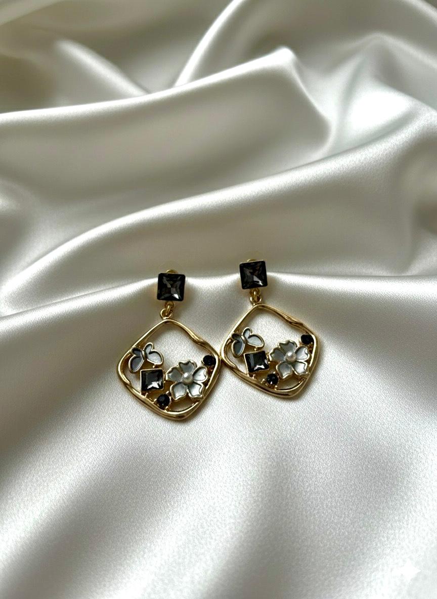 Delight in the charm of nature with the Garden Whimsy Drop Earrings. These enchanting earrings feature a translucent green butterfly stud, leading to a free-form golden frame adorned with a soft blue rose, a lustrous pearl, Playful yet elegant, these earrings blend floral and whimsical elements, perfect for adding a touch of springtime magic to any outfit.